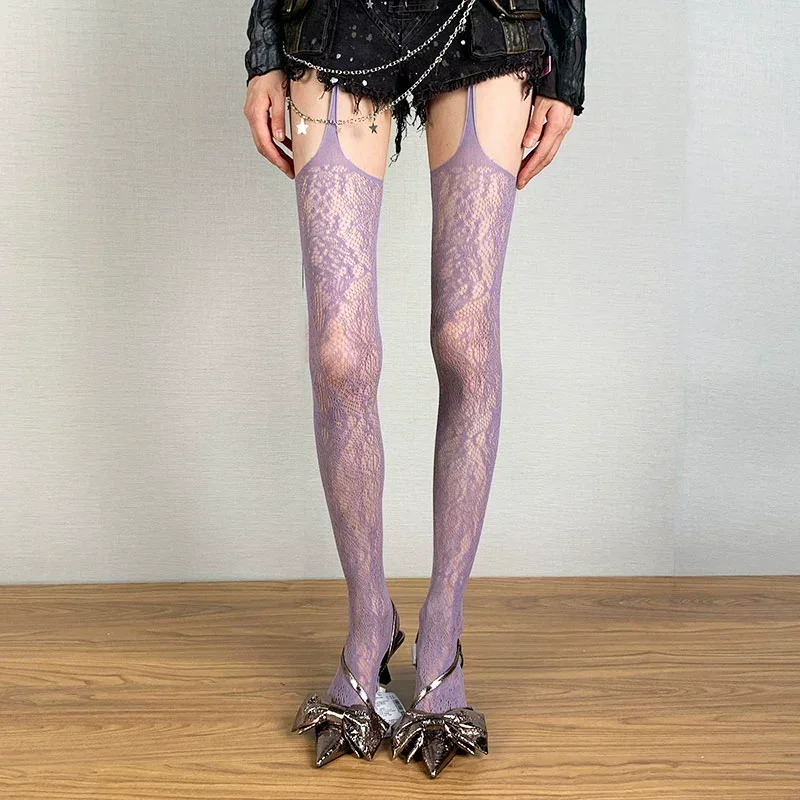 Lolita Sweet Girls Punk Style Floral Tights Colorful Thigh High Stockings Sheer Fishnet Suspender Tights Garter Belt Pantyhose