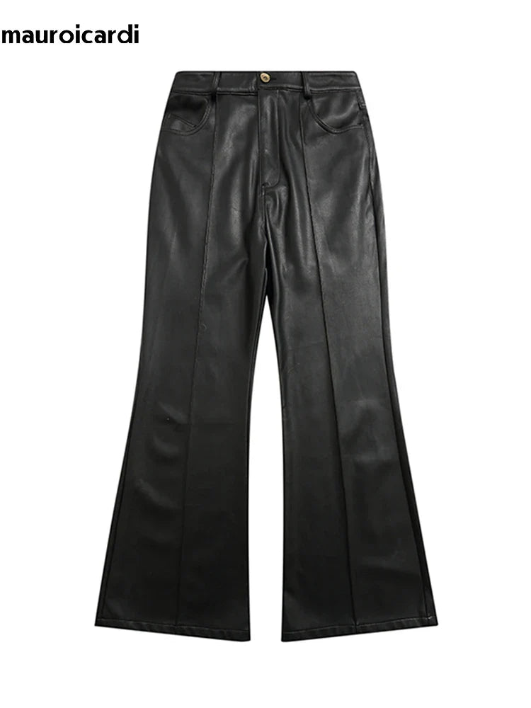 Mauroicardi Spring Autumn Cool Long Black Soft Pu Leather Flare Pants for Men High Waist American Retro Hippie Clothes 20023