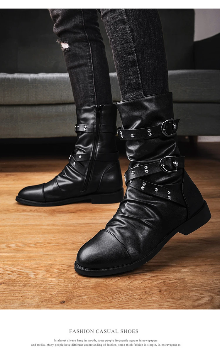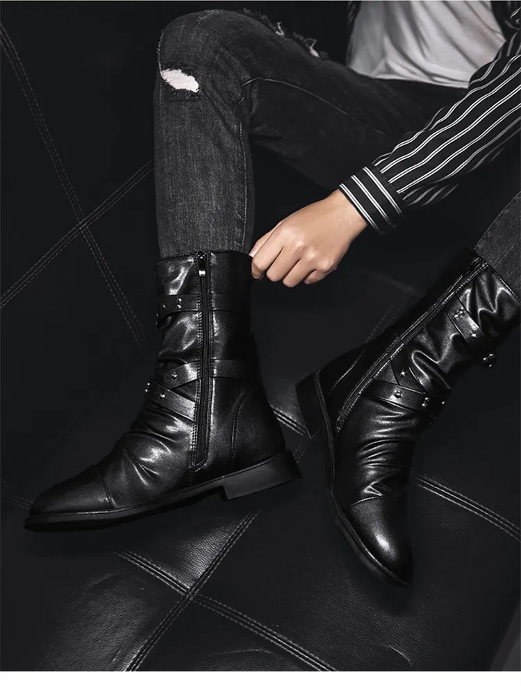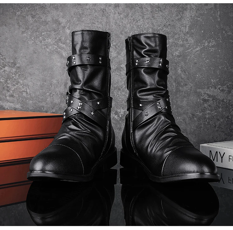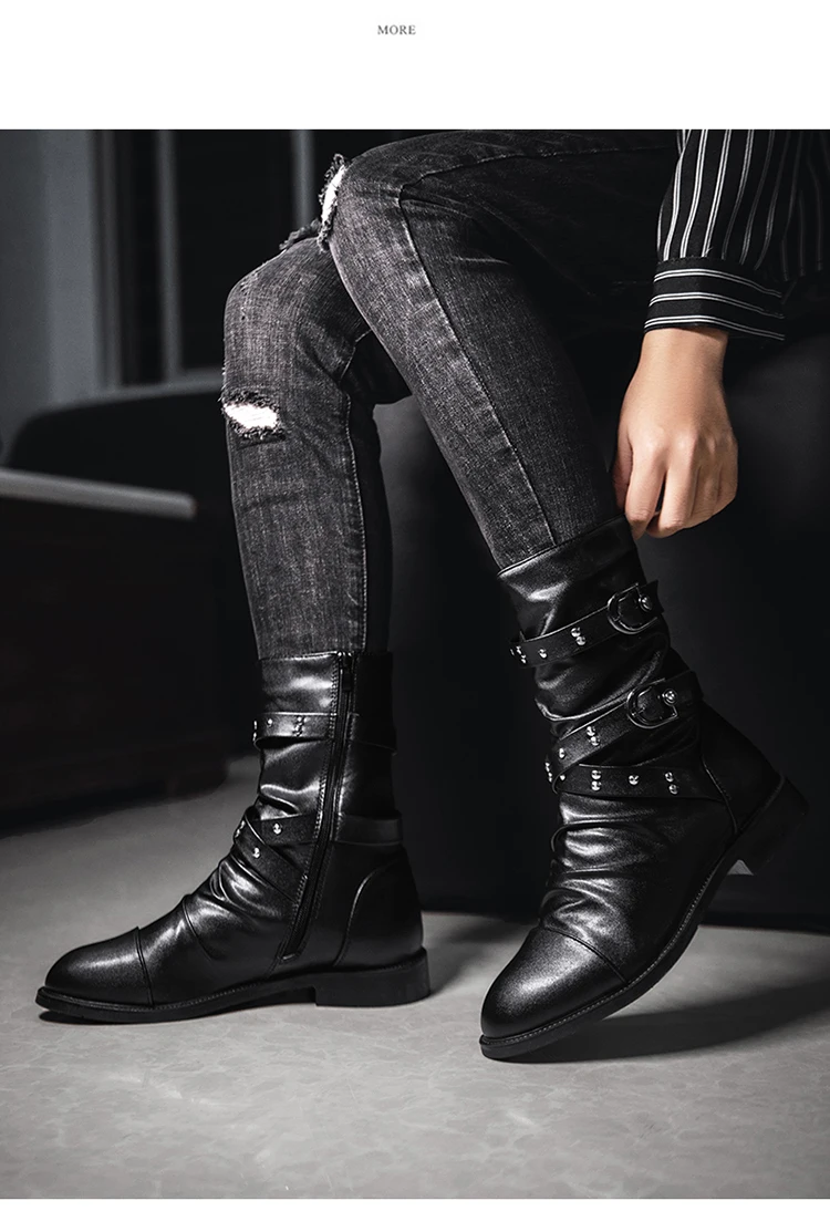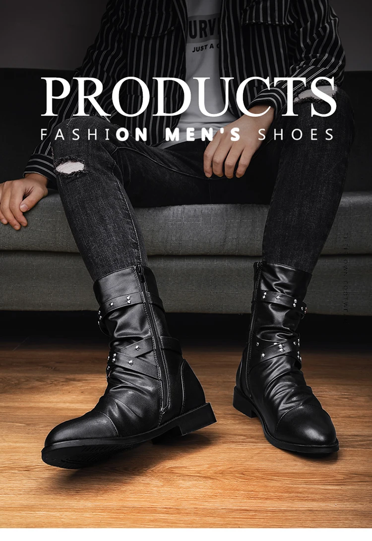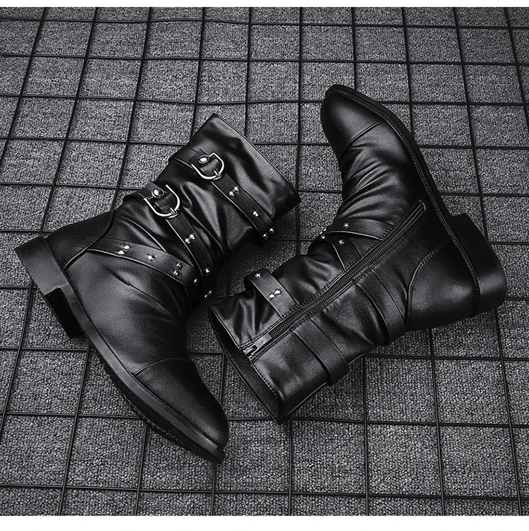 STRONGSHEN Men Fashion Motorcycle Boots Leather Boots Footwear High Top Casual Shoes Military Tactical Boots Gothic Punk Boots