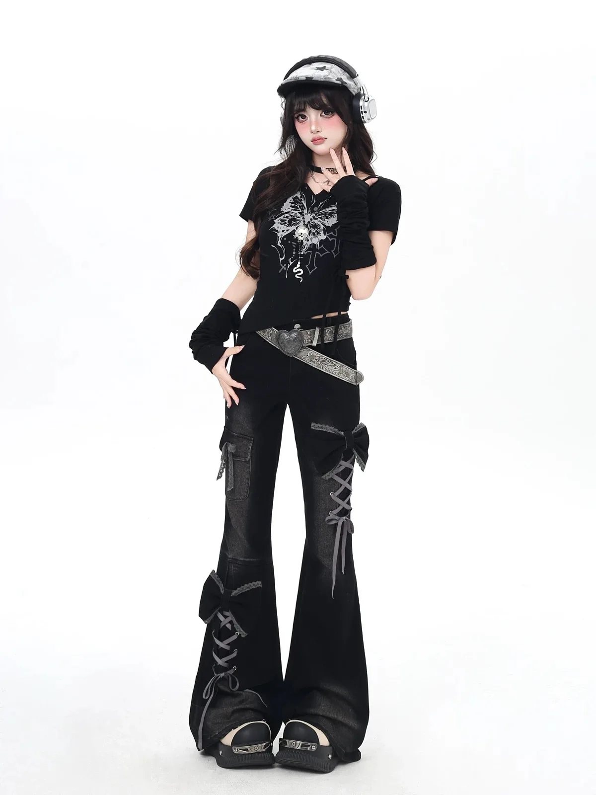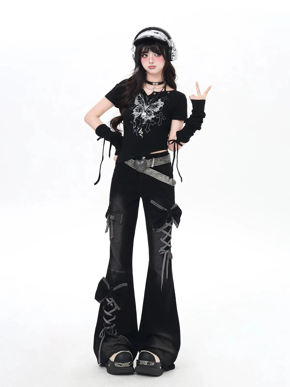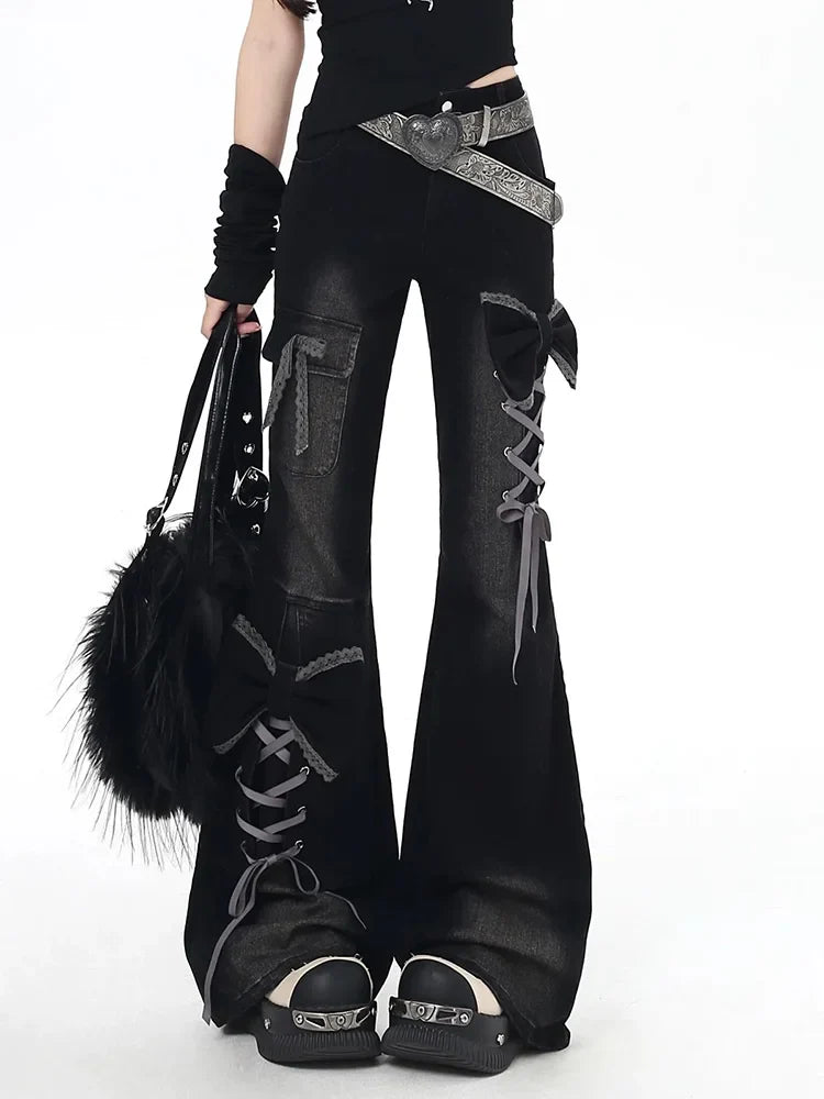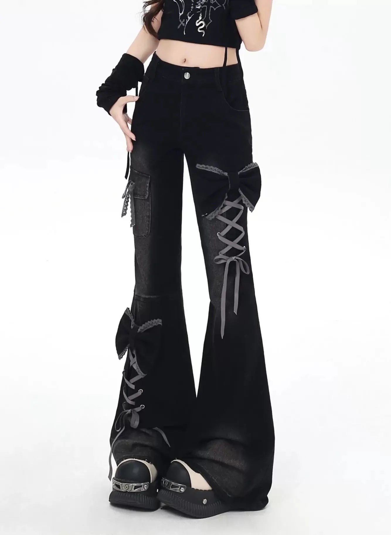 Y2K Bow Jeans Women 3D Design High Waist Slim Fit Flared Pants Spicy Girl