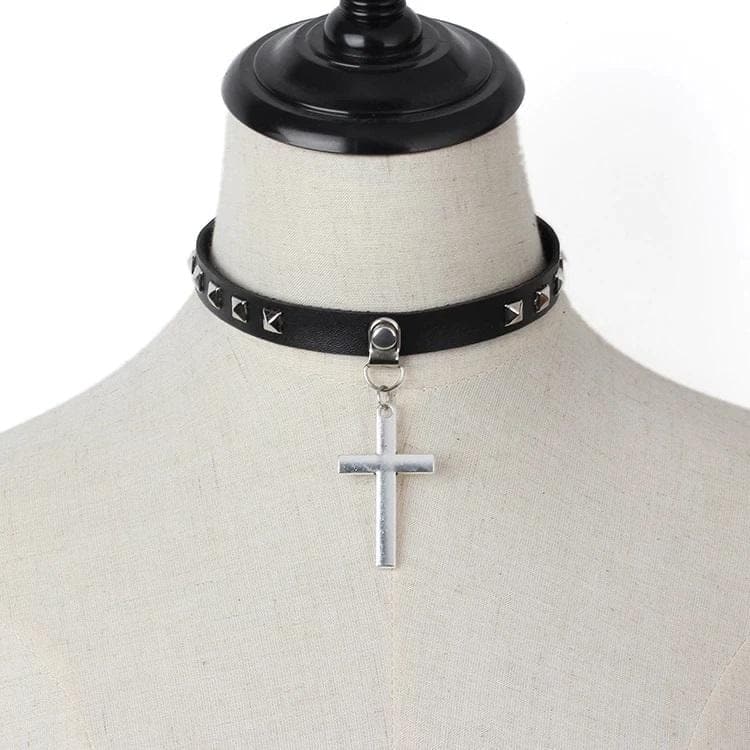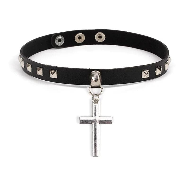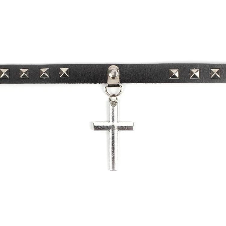 Haunt the night in this studded collar. Silver pyramid studs on the sides, plus a statement center cross. Rock your rebellious side in the genuine leather construction, complete with a silver snap-on closure for the perfect fit.