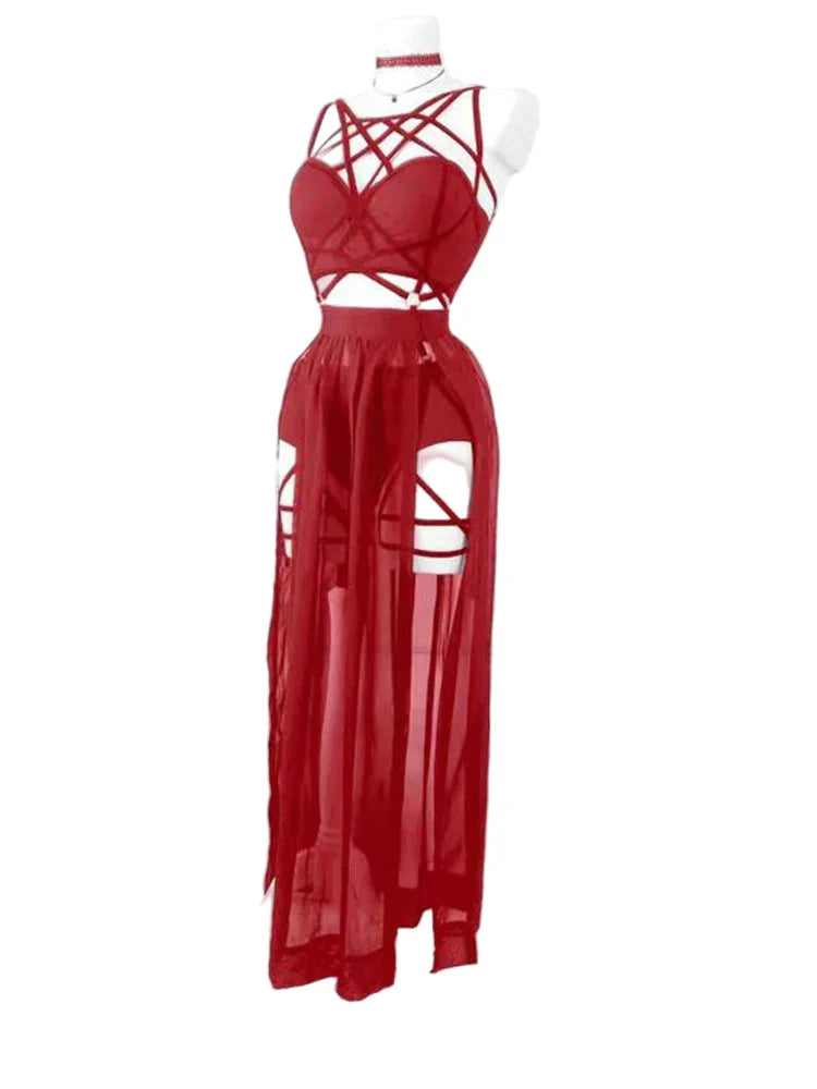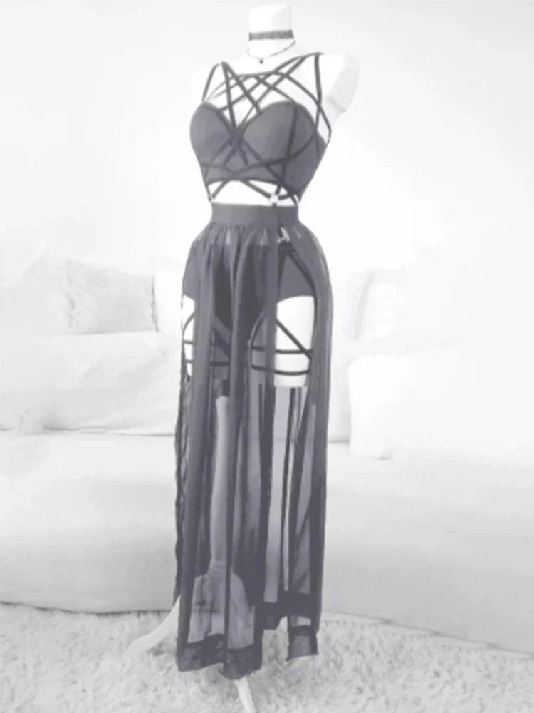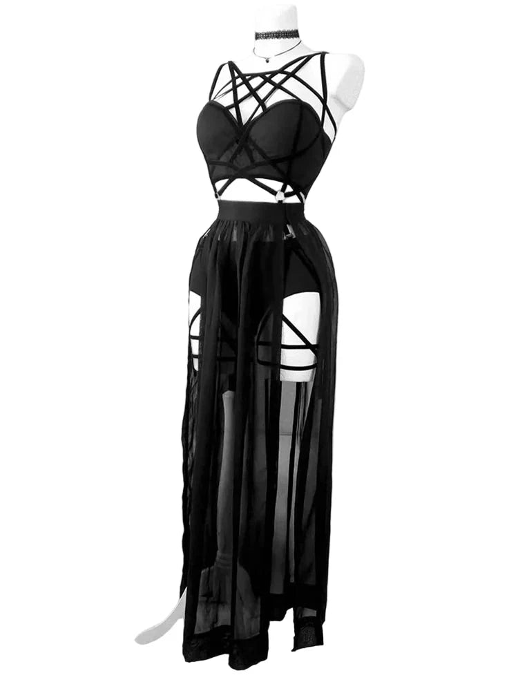 Embrace your inner darkness with the Nyxara Set from Creepy Goth. This sultry, three-piece ensemble is the perfect mix of gothic allure and modern streetwear. Featuring a strapless, hollow-out crop top, paired with a high-waisted A-line mini skirt and matching underpants, this set is designed to flatter and accentuate your figure. Made from a soft yet durable blend of cotton and polyester, the material offers just the right amount of stretch for comfort without compromising on style.