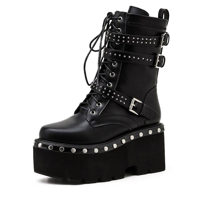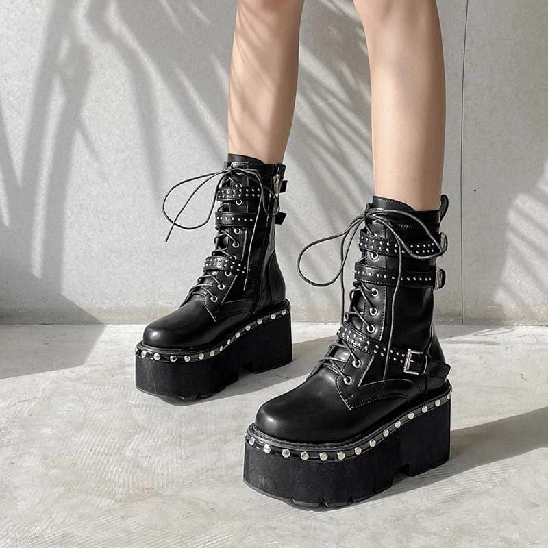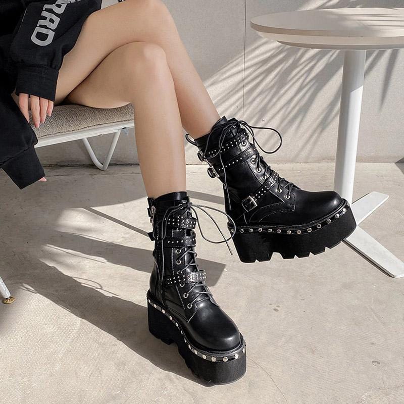 Let 'em know who's in charge in this Fancy Officer Tormented Boot featuring an ankle high shaft with three rivet buckle belts and lace-up tie closure. It has a solid high platform decorated with rivet metal pins that give off a badass gothic look!