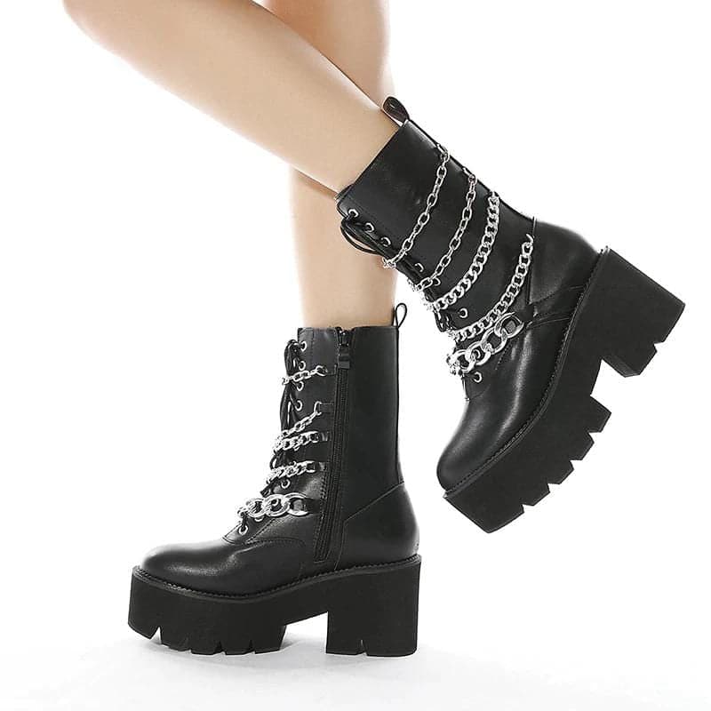 Haunt the shadows in these Riff Chunky Platform Boots! Beautiful silver chain charms haunt the quality vegan leather, possessed a 8 cm chunky heel and 5 cm platform to give your spooky self some hella height!