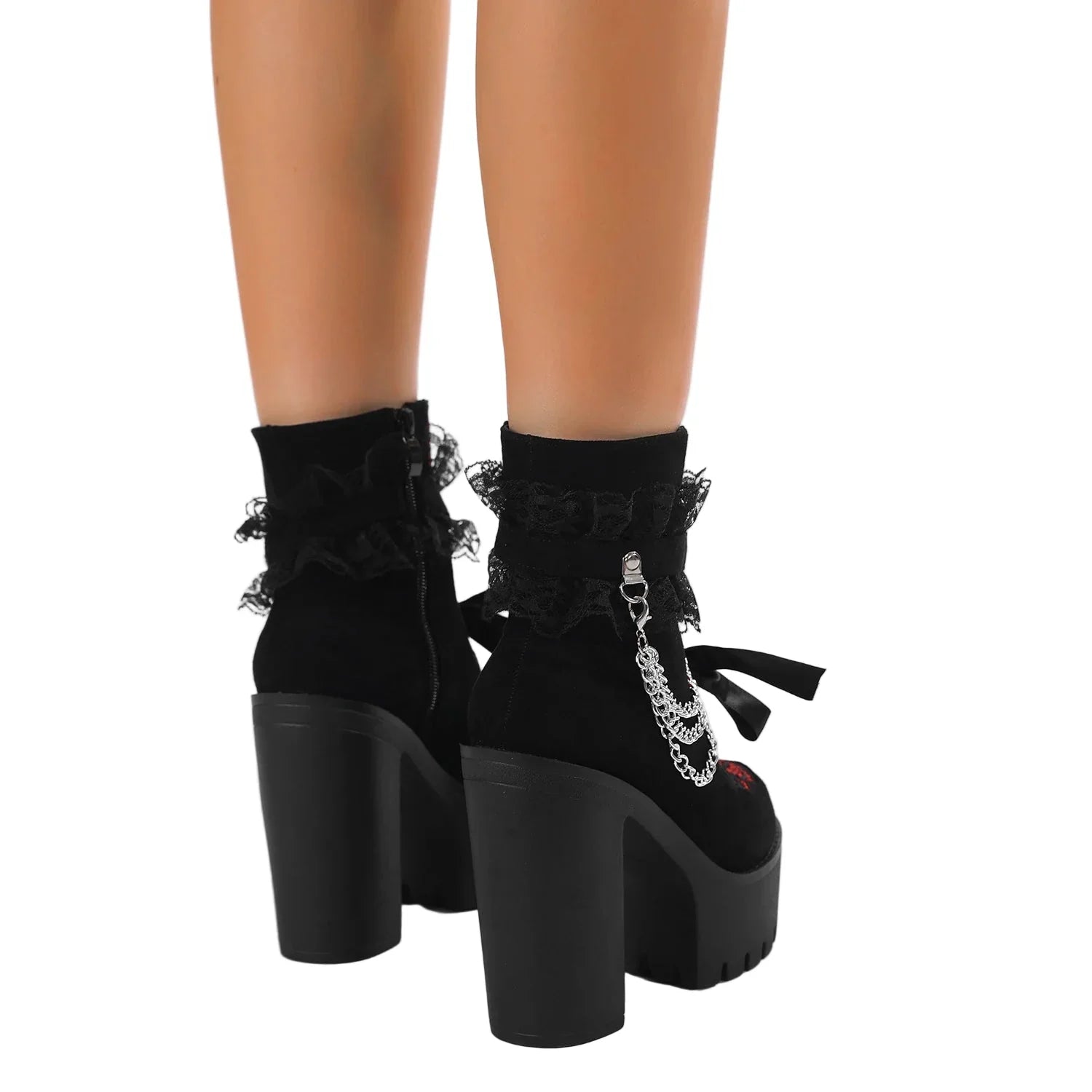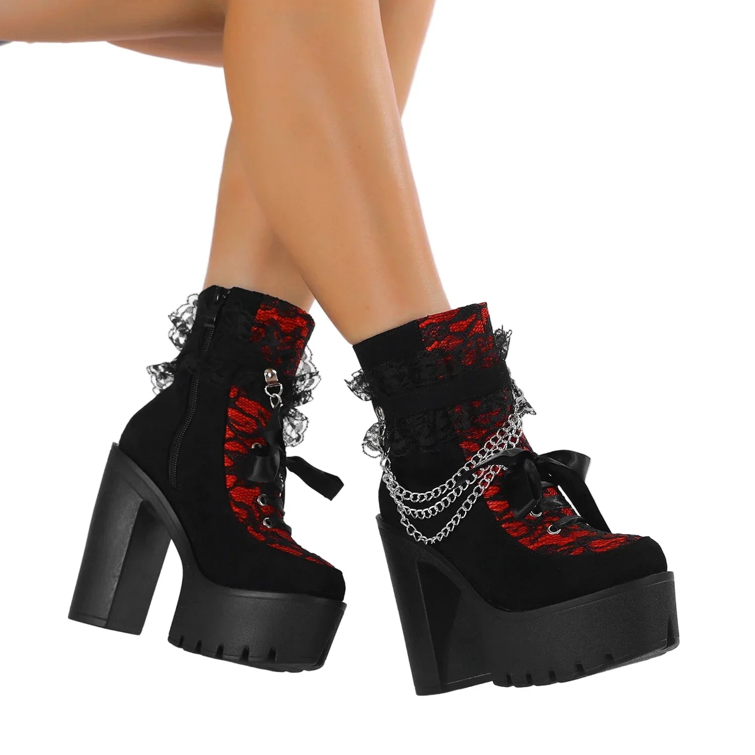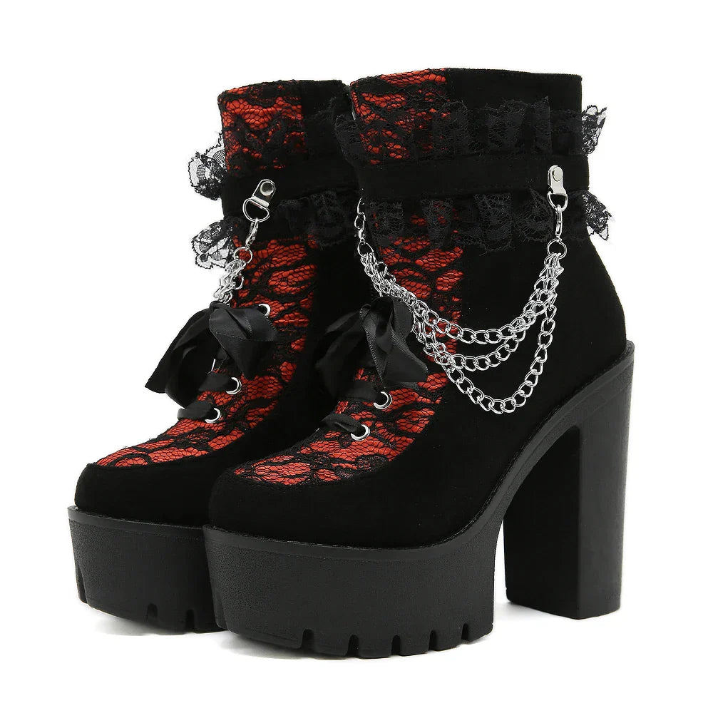 Step into darkness with Creepy Goth’s Vermyra Platform Boots — a fusion of gothic elegance and punk rebellion. These handcrafted mid-calf boots feature rich black flock velvet with blood-red lace underlays, bound together by silver chains and ribbon laces that demand attention.