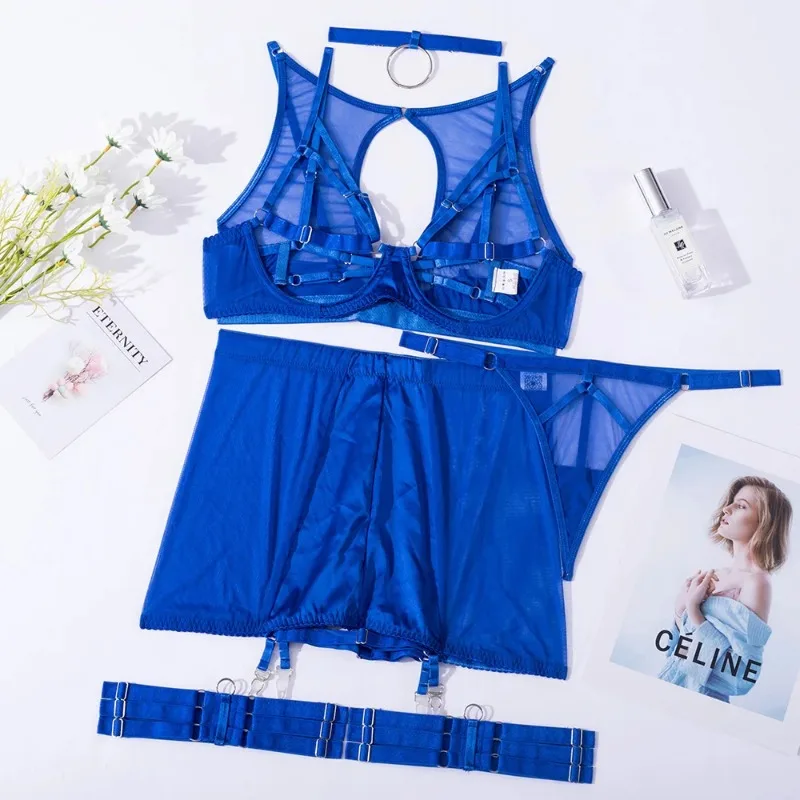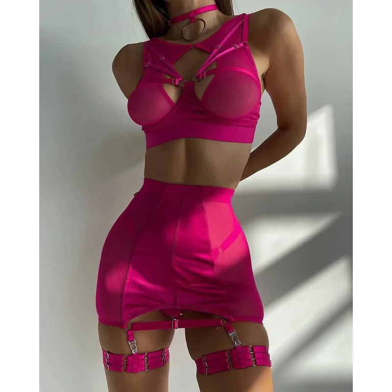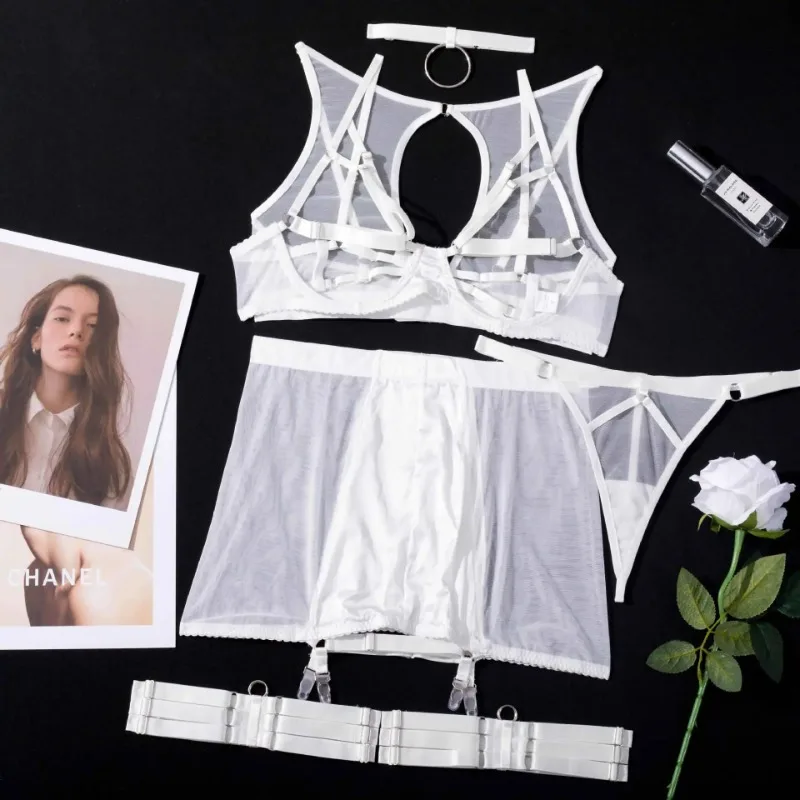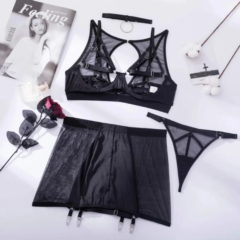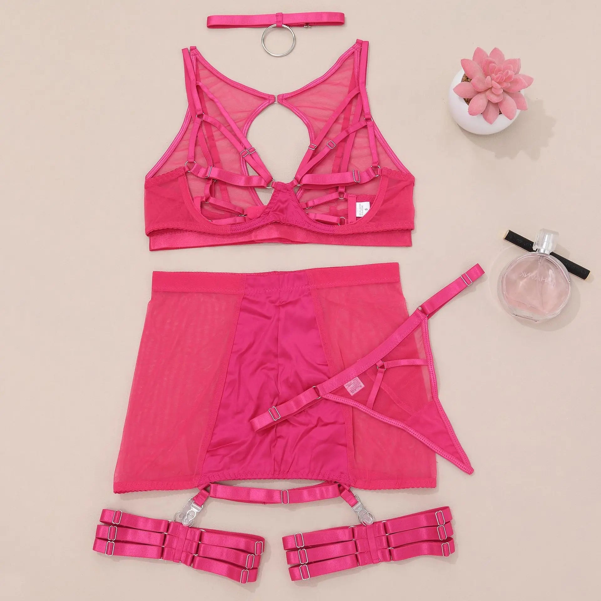 Erotic Sexy Lingerie Sets 5Pcs Fancy Underwear Mesh Patchwork Hollow Out Transparent Bra Garters Briefs Sets Bandage Sex Outfits