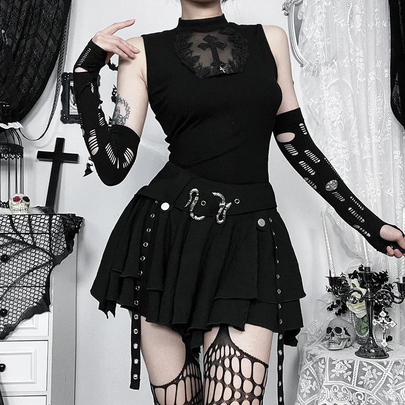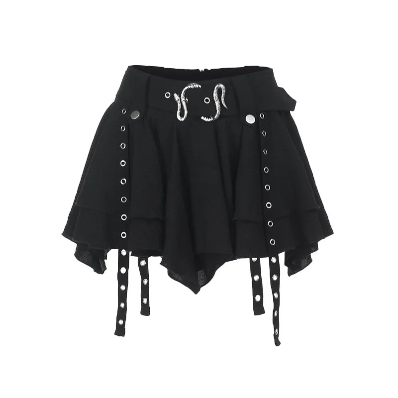 Dravika is your dark-side essential where punk rebellion meets gothic elegance. With its irregular hem and pleated silhouette, this mini skirt adds movement, edge, and attitude to every outfit. The solid tone and three-dimensional detailing bring texture and depth, while the natural waist and loose fit keep things effortless and wearable.