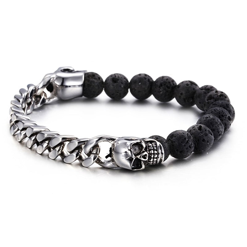 The Alchemy Skull Bracelet is made from a combination of natural volcanic rock and polished stainless steel.