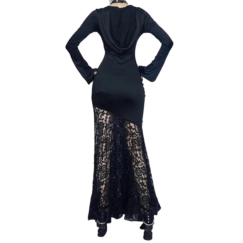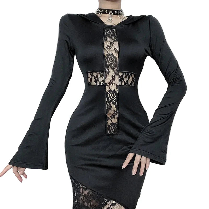 Unleash your dark elegance with Noctira, a striking hooded dress that effortlessly blends gothic charm with contemporary style. Crafted from high-quality polyester and spandex, this ankle-length dress features a slim, pencil silhouette designed to flatter your form. The dramatic flare sleeves and intricate lace splicing offer a unique, sophisticated touch, while the hollow-out cross design adds a bold statement of gothic allure.